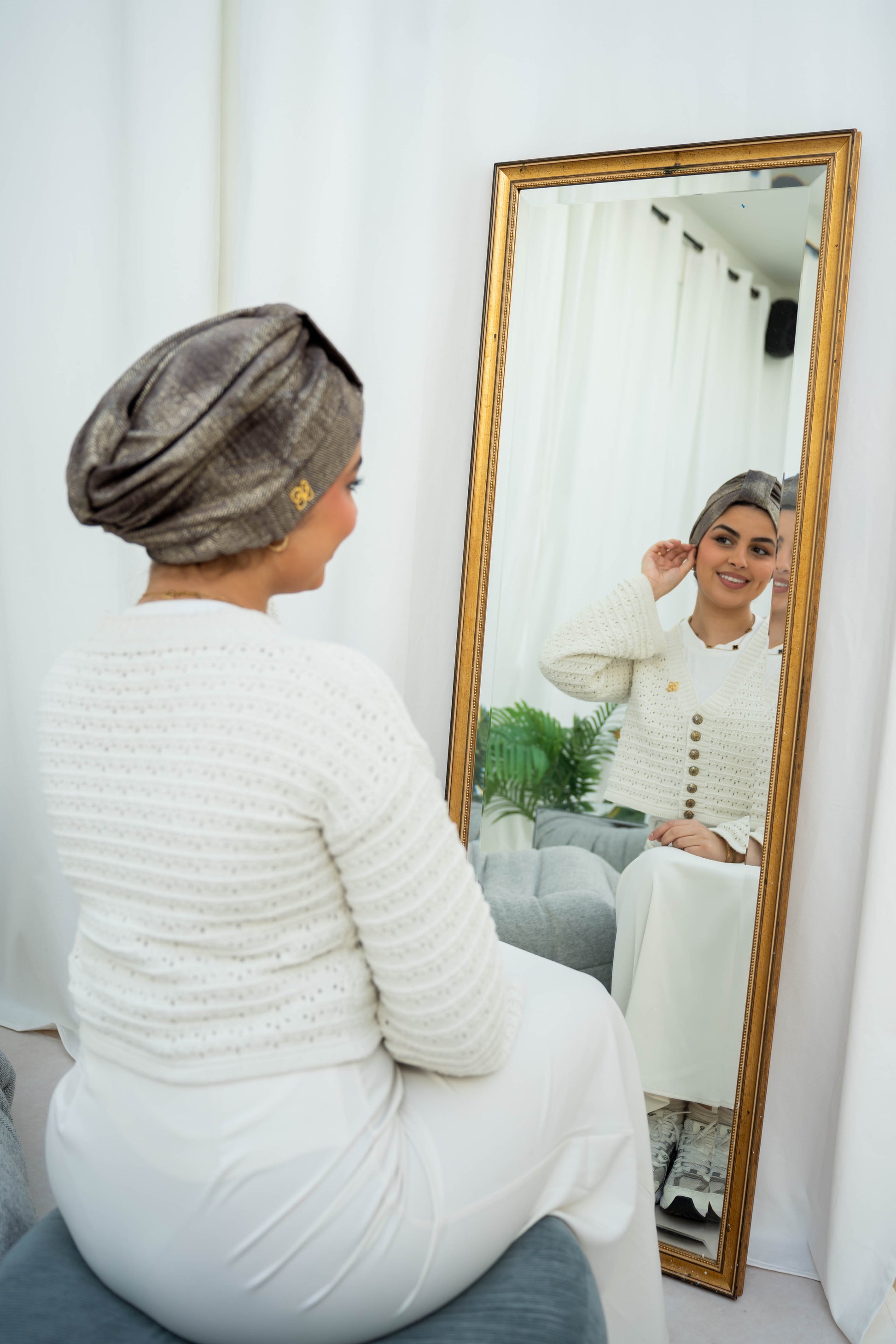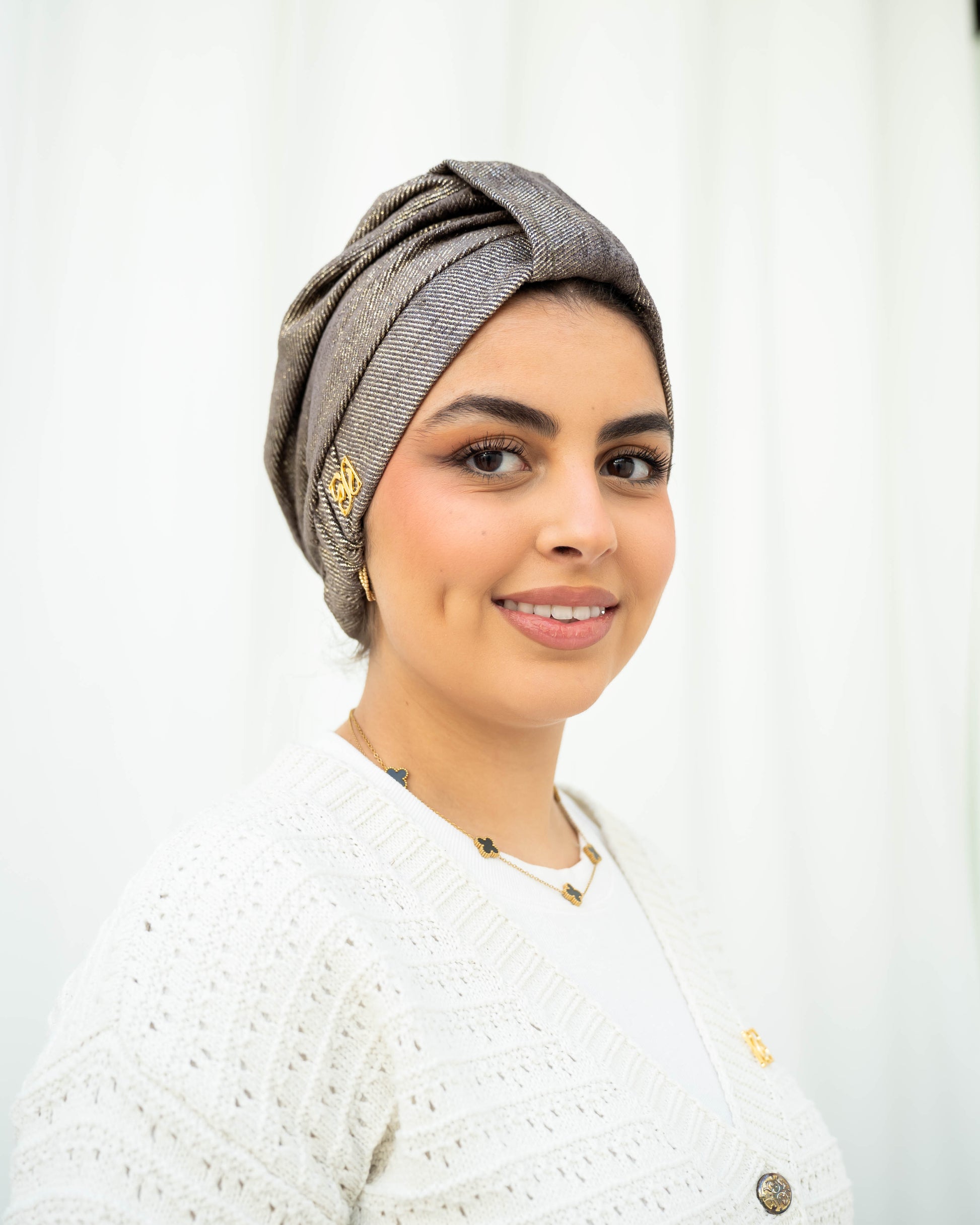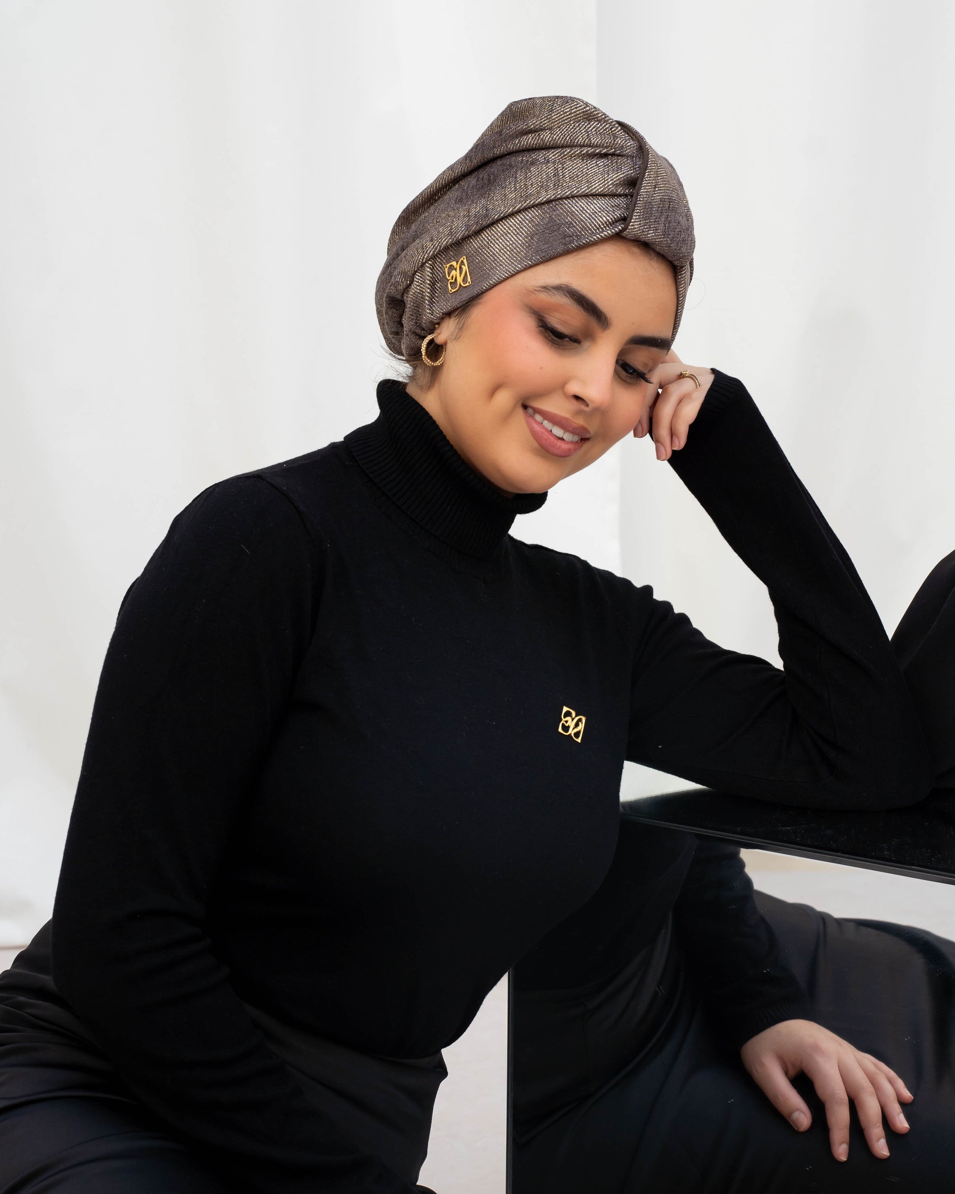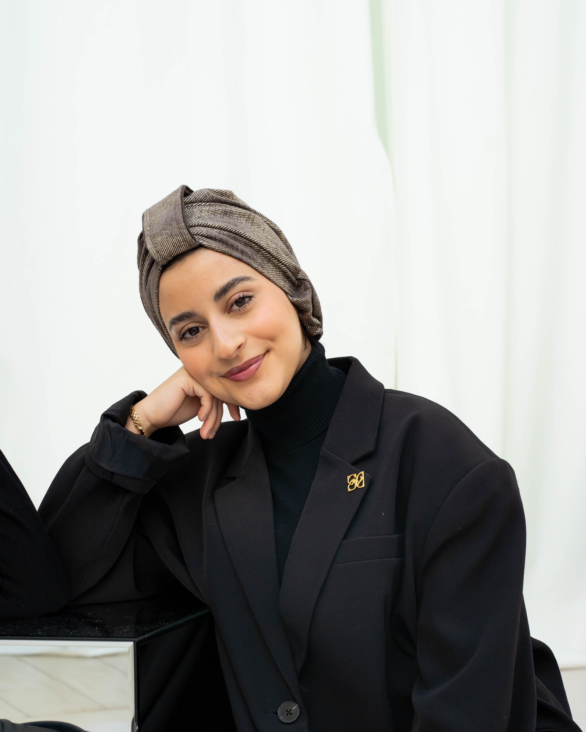 A touch of gold shine at the front adds a sophisticated accent, making this turban perfect for both casual and formal occasions. Its comfortable fit and easy-to-wear design make it an ideal accessory for any season.