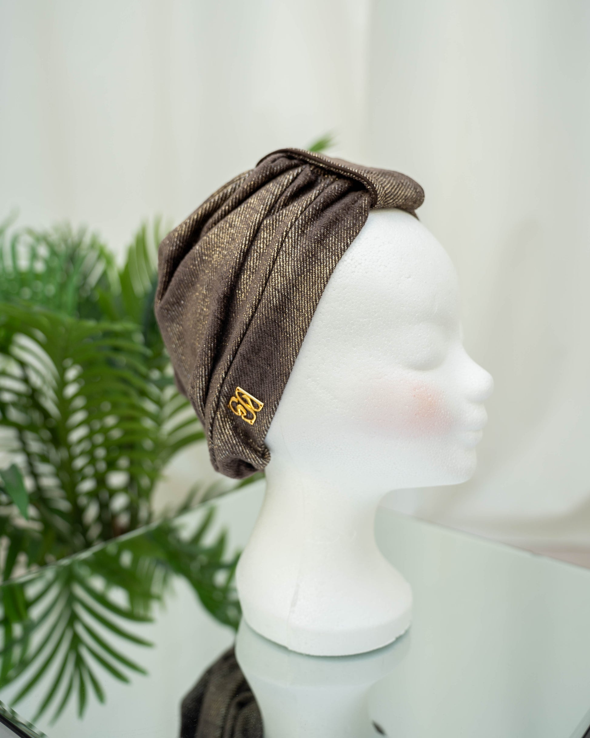 Elevate your everyday style with this chic denim turban. Crafted from high-quality denim-like fabric, this turban offers a unique blend of casual comfort and refined elegance. The brown color, enhanced by subtle lighter streaks, creates a textured and stylish appearance that complements any outfit.