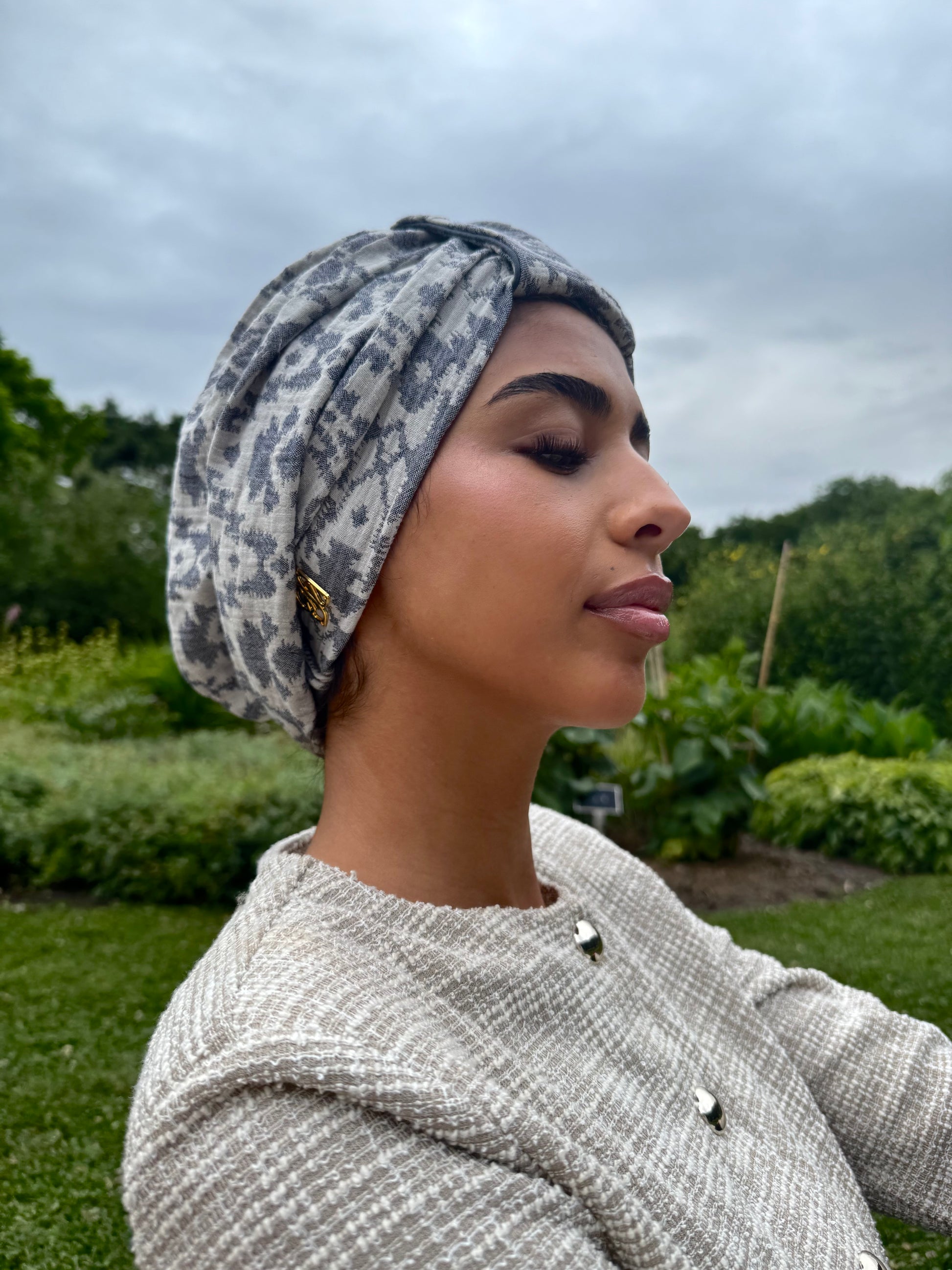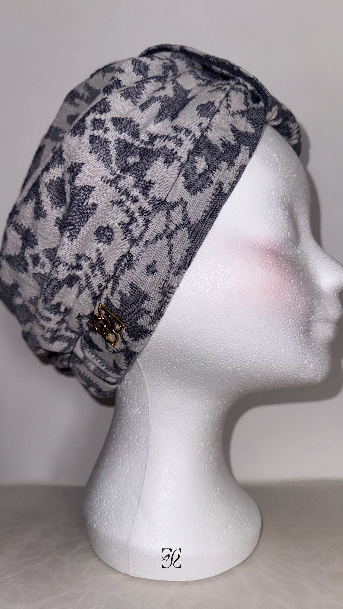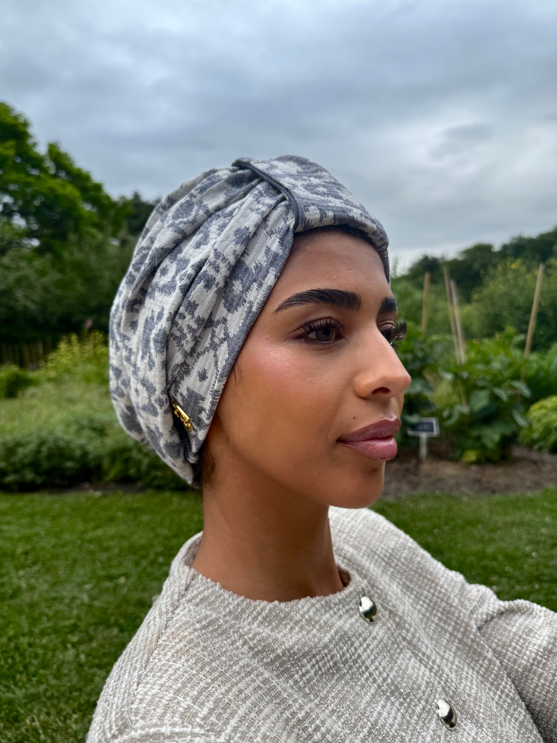 Understated, soft and versatile — the Niebla Azul turban features a calm mix of grey and blue tones with a subtle abstract pattern.