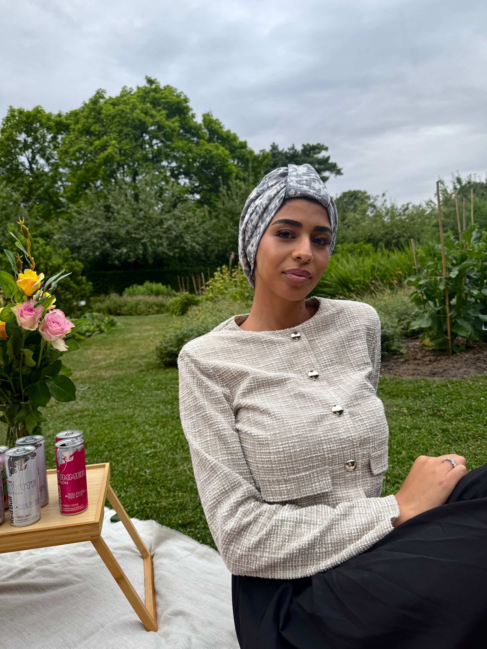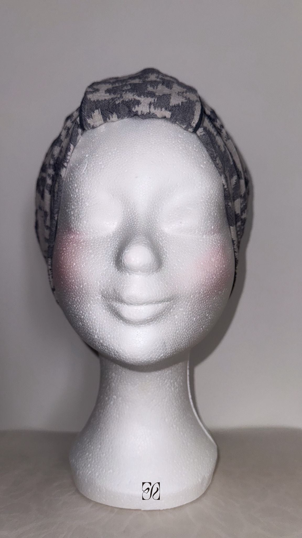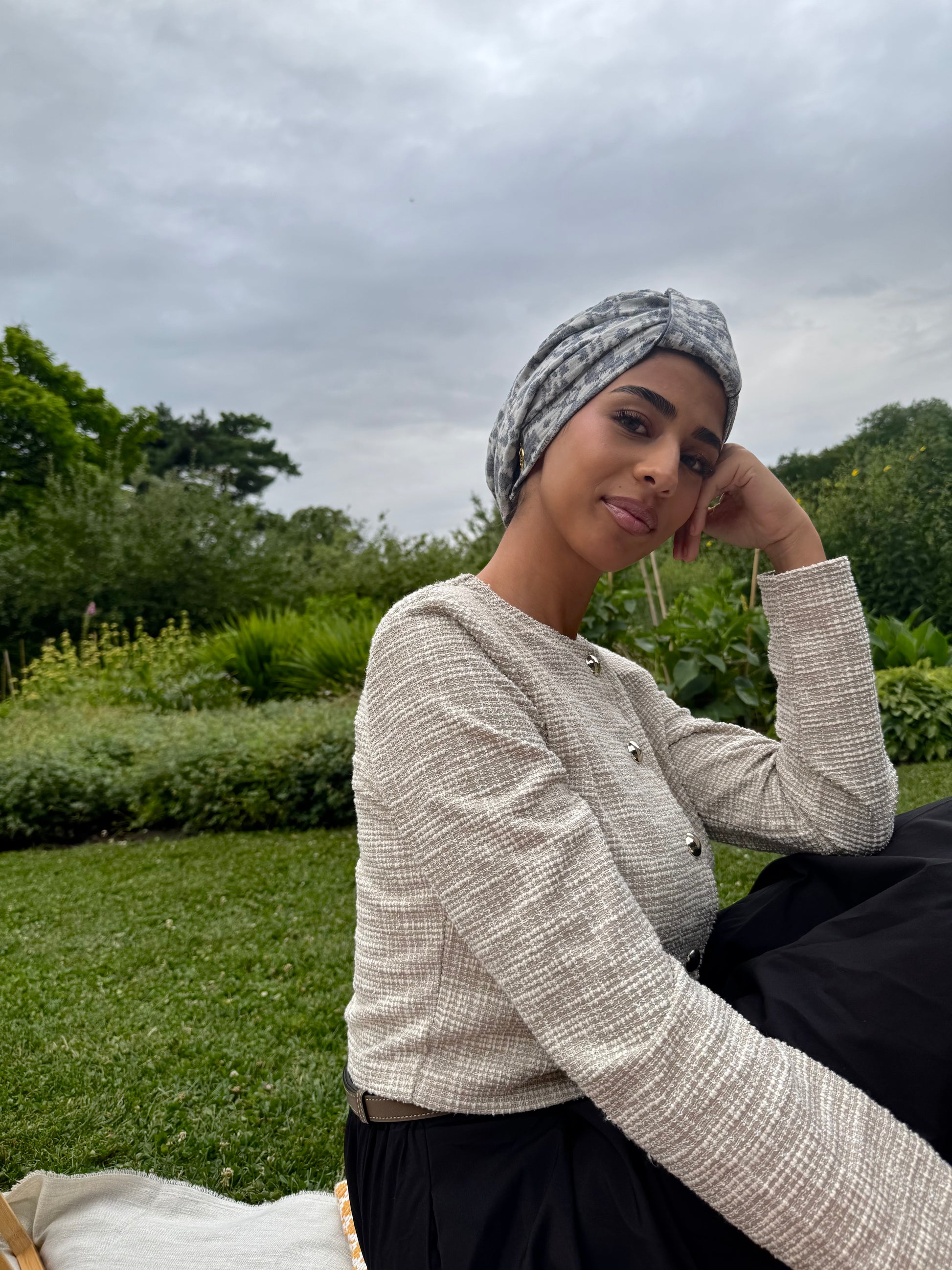Understated, soft and versatile — the Niebla Azul turban features a calm mix of grey and blue tones with a subtle abstract pattern.