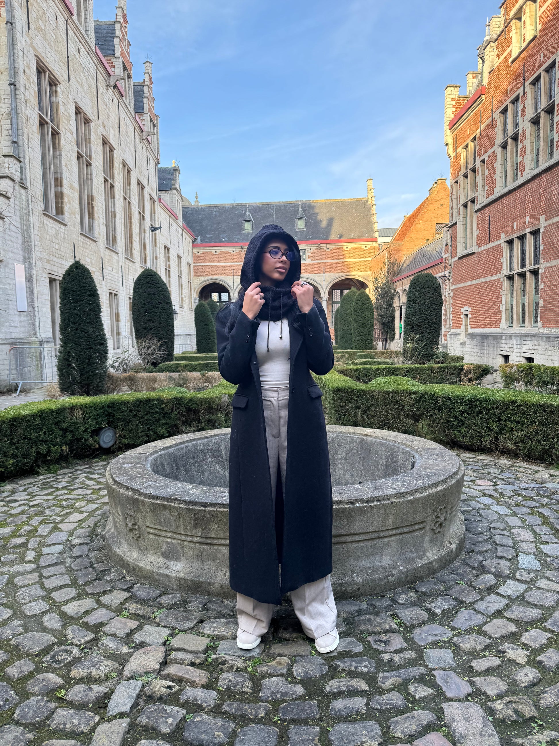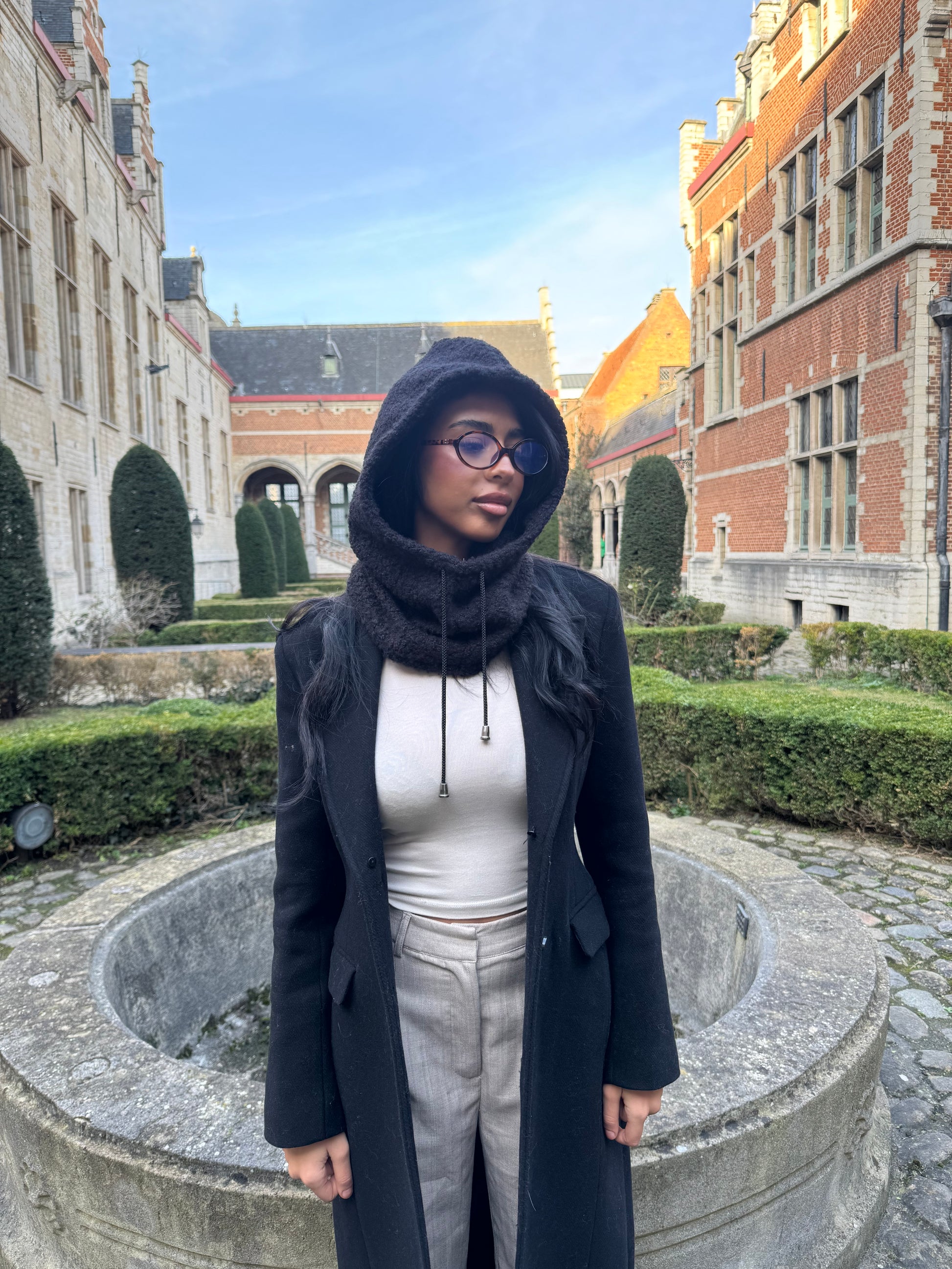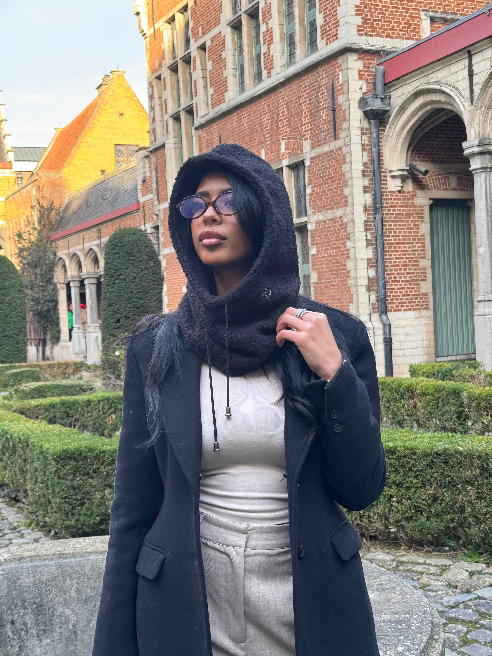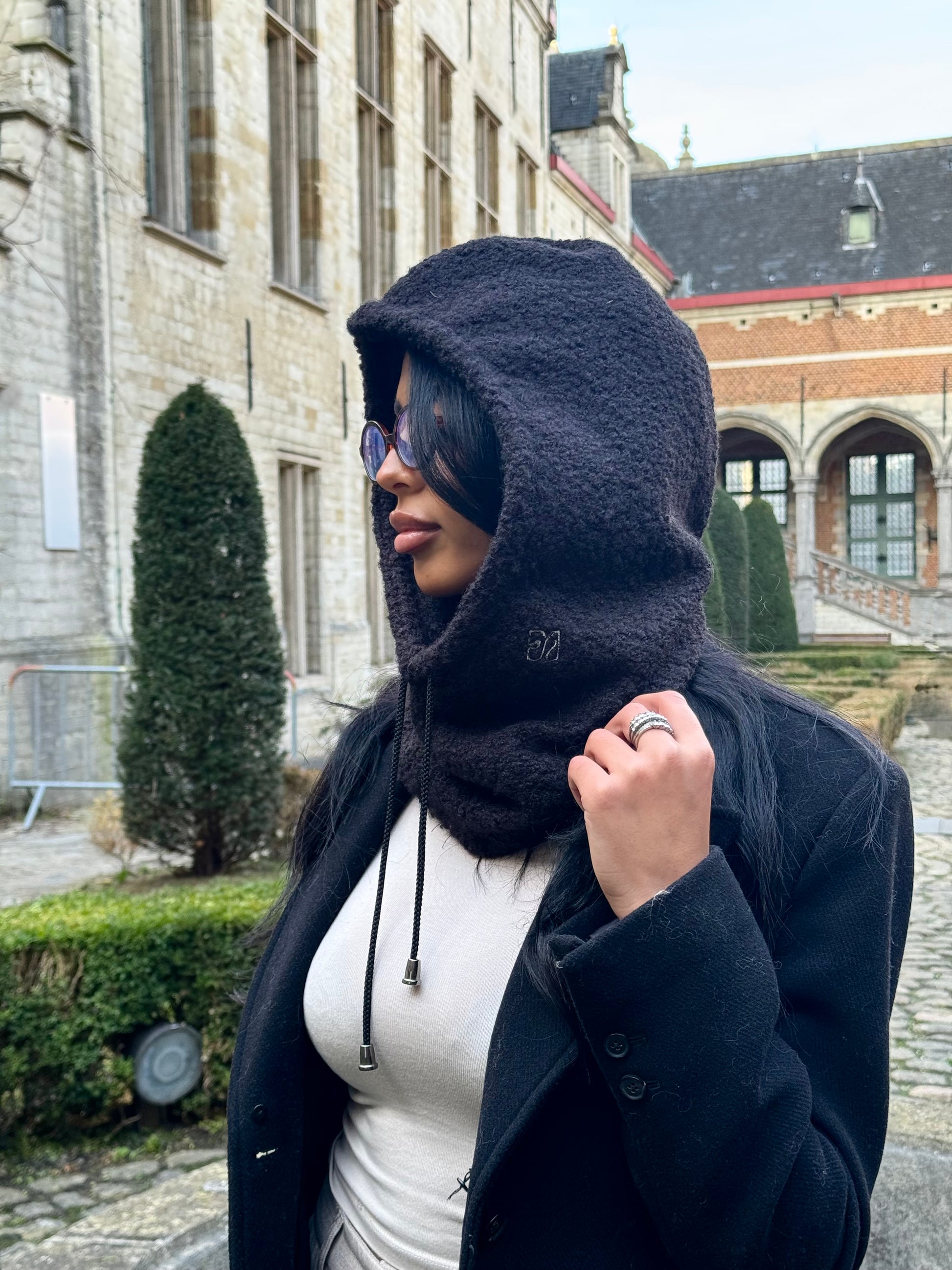 Structured softness meets timeless form — Sombra is your all-in-one hooded scarf for colder seasons. In its darkest variation, the design takes on a bold simplicity that pairs effortlessly with everyday looks. The soft bouclé finish and sculpted shape create balance between edge and comfort.