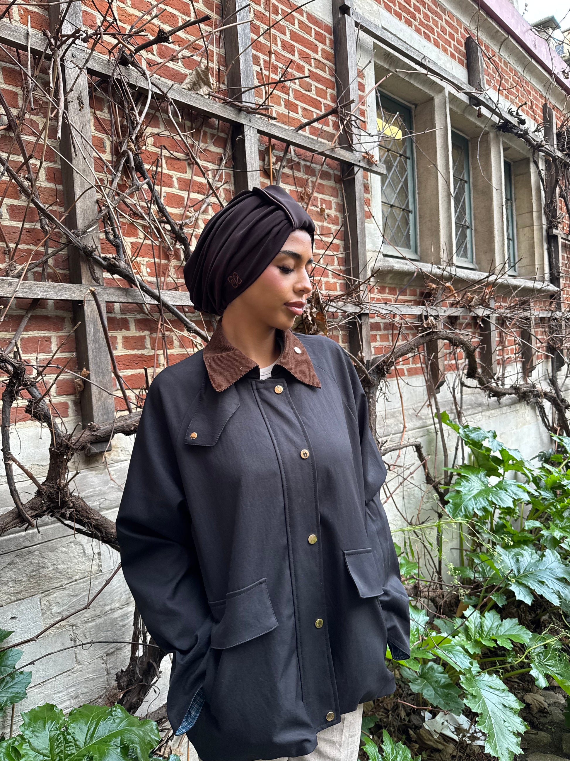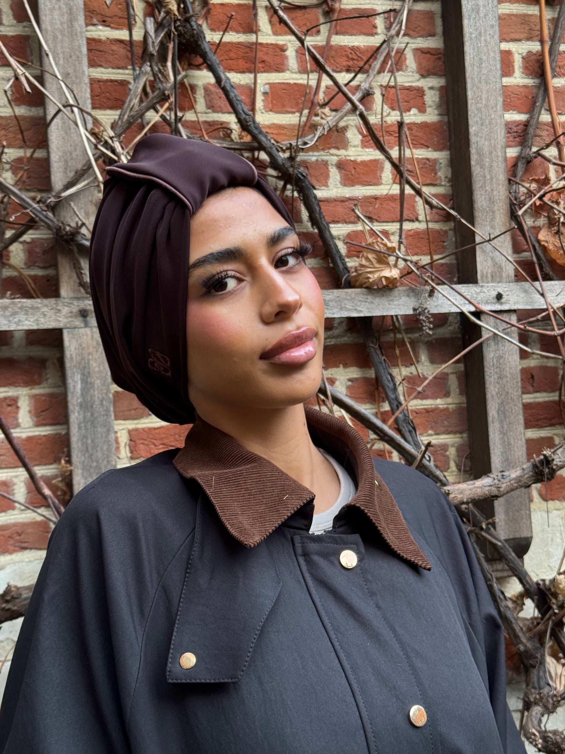 Elegant, sculpted and serene — the Umber turban reflects the quiet strength of the earth beneath us. Its dark chocolate hue creates a powerful contrast with any look, offering refined presence and depth. Crafted from a smooth, stretch fabric, it embraces your silhouette with ease while maintaining its structured shape.